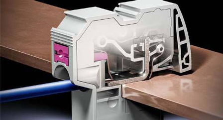 The push-in conductor connection clamps enable quick and easy attachment to the busbar. The stripped end of the conductor is connected to the busbar simply by pushing them together, and the connection is held securely in place with a separate spring mechanism. The spring optimises conductivity by removing oxide layers that have formed on the busbar. And optimal contact is maintained by the integral contact block with its defined and raised contact points.